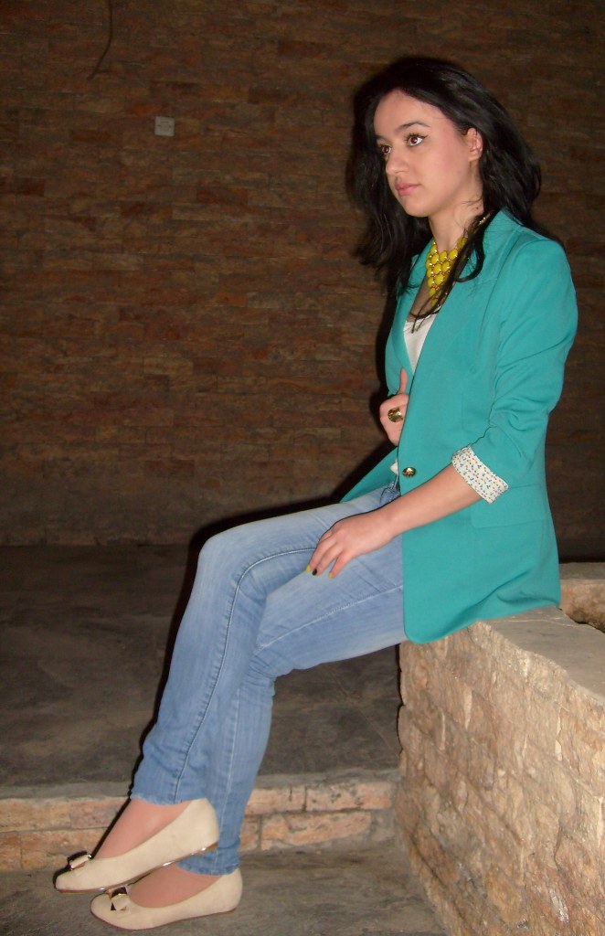 Одлична комбинација, совршен колорблок! Сакото многу слатко ти стои и супер си го искомбинирала со жолтото ланче и кремастите балетанки и чанта!